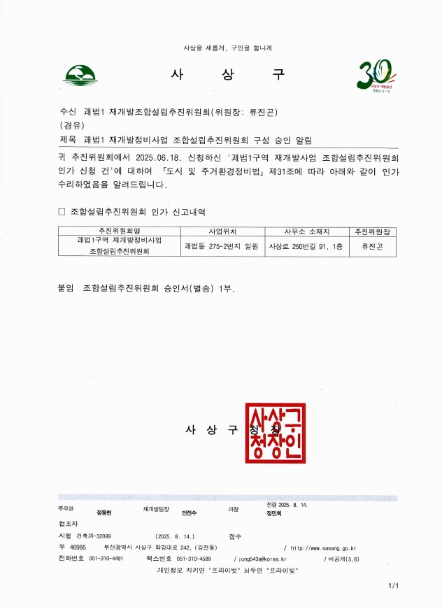 부산 사상구 괘법1구역이 추진위원회를 승인받으면서 재개발 조합설립에 본격적으로 착수한다. 이 일대는 불과 4일 만에 추진위 승인을 위한 토지등소유자 과반수 동의를 확보하는 등 주민들의 사업 의지가 뜨겁다. 괘법1구역 재개발 추진위원회(위원장 류진곤)는 지난 14일 사상구청으로부터 추진위원회 승인을 통보받았다고 밝혔다. 앞서 집행부는 지난 6월 18일 추진위원회 구성을 신청한 바 있다.