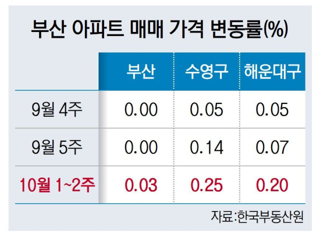 2022년 6월부터 시작된 부산의 집값 하락세가 1211일 만에 상승세로 전환됐다. 수영구와 해운대구를 필두로 아파트 매매가격이 오르면서 인근으로 온기가 확산하고 있다. 특히 ‘10·15 부동산 대책’이 반영되지 않은 통계여서 앞으로 상승세도 기대된다. 16일 한국부동산원의 10월 둘째 주(10월 13일 기준) 전국 주간 아파트 가격 동향에 따르면 부산 아파트 매매가격은 전주 대비 0.03%로 올랐다. 2022년 6월 20일 시작된 부산 아파트 매매가격 하락은 3년 4개월여간 이어졌다. 낙폭이 컸던 2022년 12월엔 한 주에 0.7%씩 빠졌고, 이 기간의 하락 폭을 모두 더하면 -20%에 달한다.