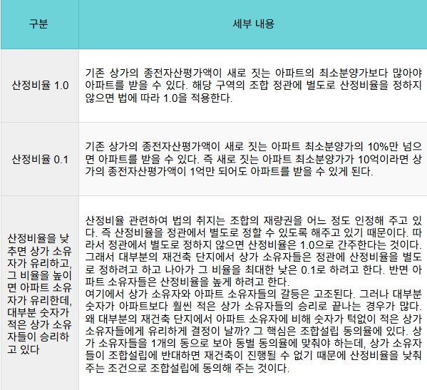그리고 재건축인 경우에는 정관에서 정한 '산정비율'이 중요하다. 산정비율이란 상가 조합원이 아파트를 받을 수 있는지를 좌우하는 숫자로, 대개 1.0이다. 즉 정관에서 별도로 정하지 않으면 1.0을 기준으로 하게 된다.
