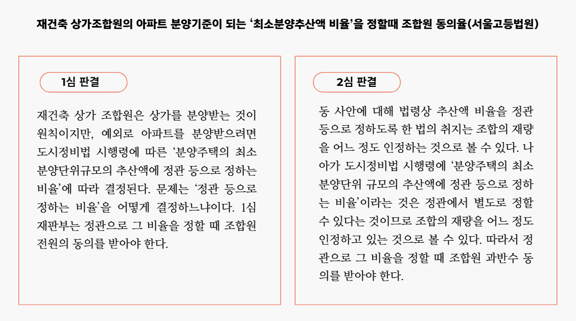 재개발과는 달리 재건축의 경우, 상가소유자에게는 상가를 공급하는 것이 원칙이다. 하지만 예외적으로 상가를 건설하지 않거나, 기존 상가의 종전자산평가액이 ‘최소분양단위규모의 추산액에 정관 등으로 정하는 비율(정관 등으로 정하지 않은 경우 1)을 곱한 가액’보다 크면 아파트를 공급할 수 있도록 규정하고 있다. 아무튼 이번 판결로 상가 조합원의 아파트 분양 문턱이 대폭 낮아질 가능성이 높아졌다.
