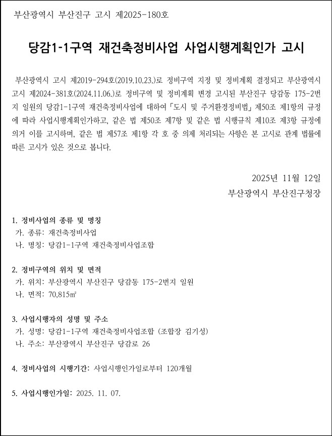 시공사는 GS로 선정(2021.11.13.) 되었고 최고 35층 1,377세대가 지어질 예정이다. 당감1-1구역이라고 하면 잘 모르는 경우도 많은데, 당감 삼익아파트를 말한다. 당감1재건축은 인근 무궁화아파트다. 부산진구청은 2025년 11월 7일자로 당감1-1구역 사업시행인가 고시를 했다.
