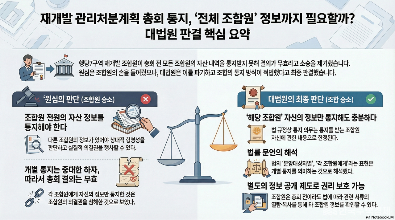 관리처분총회 전 조합원에게 통보해야 할 정보의 범위가 조합원 개별 정보로 한정된다는 대법원의 판결이 나왔다. 이번 대법원의 확정 판결로 법원마다 엇갈린 판단을 내렸던 분양대상자별 통지범위에 대한 논란은 종지부를 찍게 됐다. 대법원 제1부는 2025년 12월 11일 서울의 A재개발구역 내 토지등소유자 B씨가 조합을 상대로 낸 ‘총회결의 무효 확인’ 상고심에서 원고 승소 판결을 내렸던 원심을 파기하고, 사건을 서울고등법원으로 환송한다고 판결했다. 지난 2022년 6월에 항소심 판결이 내려졌다는 점을 감안하면 대법 판결까지 무려 3년 이상이 걸린 셈이다.