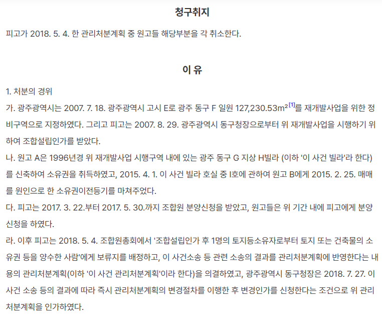 판결 결과는 조합측의 승리였다. 사실 지분쪼개의 기준은 권리산정기준일인데 기준일 이전에 건축허가를 받았다는 것은 그 행위를 선의로 보아야 하는 측면이 없지는 않지만 판결은 조합측의 손을 들어주었다. 이유를 보면, <도시정비법> 제77조제1항제4호의 나대지에 건축물을 새로 건축한 경우에 해당하지 않으려면 권리산정기준일 당시에 이미 토지등소유자 수가 더 이상 증가하지 않으리라고 볼 수 있을 정도로 건축물이 지어져야 한다는 것이다.